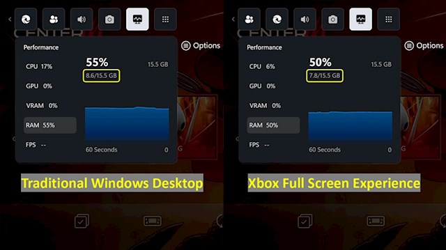 微星分享的内部测试数据显示,当使用Xbox全屏模式替换普通Windows桌面时,系统内存占用有所下降。