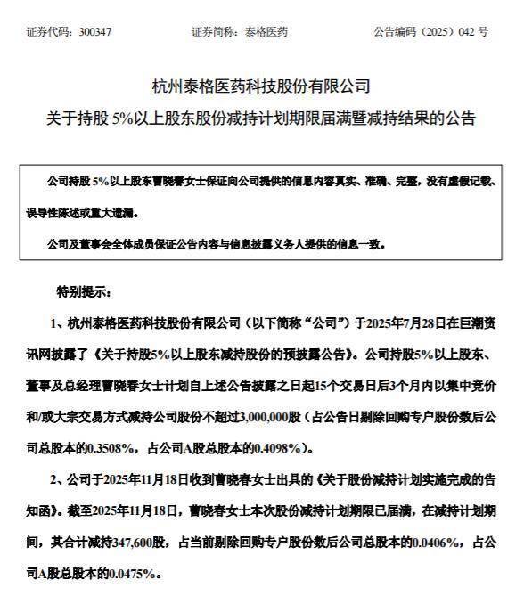 泰格医药11月18日晚间公告称,其总经理曹晓春股份减持计划期限届满,期间累计减持34.76万股。今年前三季度公司净利润增长但扣非净利润减少,业内认为临床CRO行业有复苏迹象。