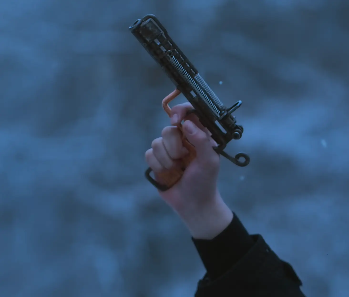 崔国明拿着自制的变速自行车车链子做了一把压火柴的火药枪,从投入来讲:这把火药枪贵啊,花了两万多。